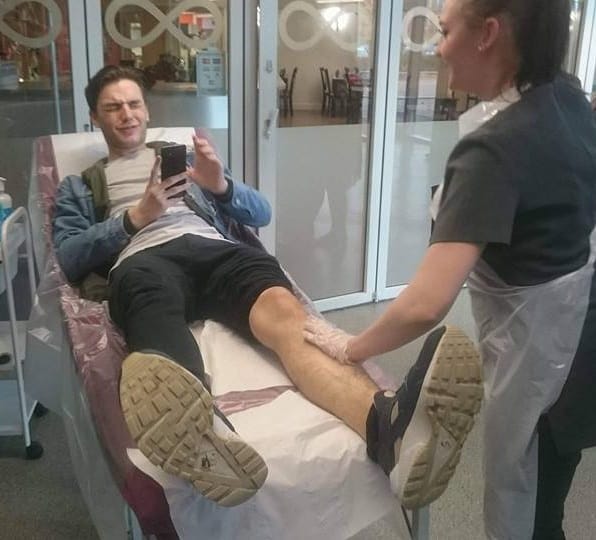The guys braved a leg wax in an effort to help raise funds for a group trip to London.