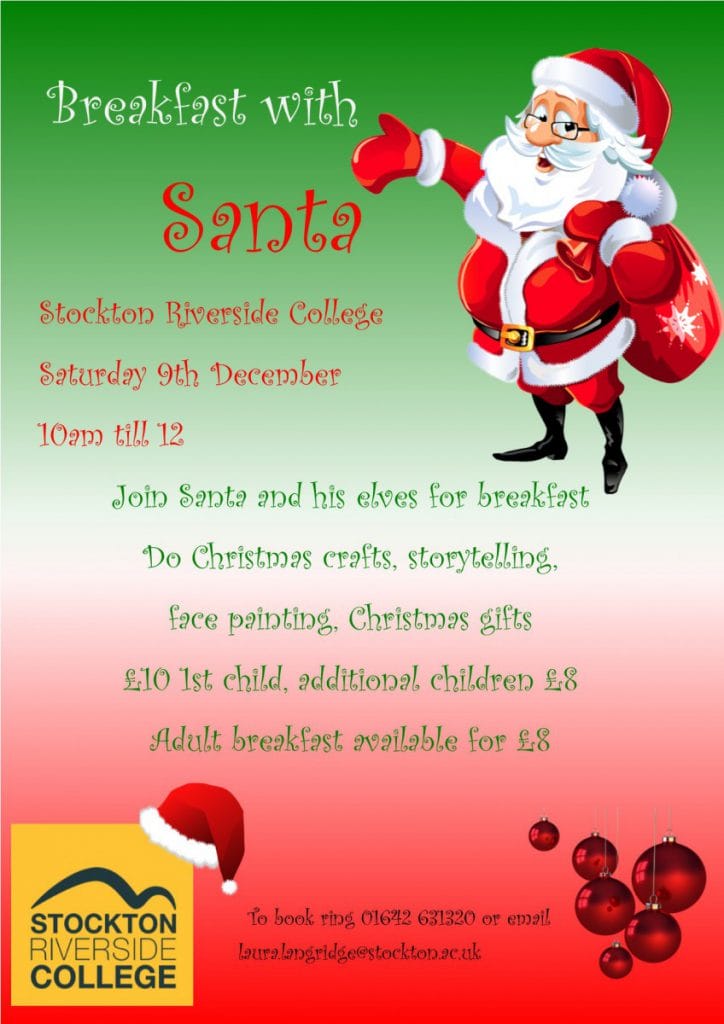 Santa’s little helpers are serving up a feast for young visitors to Stockton Riverside College.Catering and hospitality students are organising a Breakfast with Santa with the opportunity to tuck into a full English and meet the big man himself.
